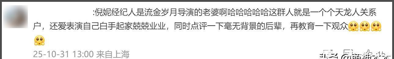 然后又牵扯到了倪妮,因为秦雯补了一句“倪小姐也没找过呀”,虽然没找过,但秦雯称自己也“没少管”,一下子把倪妮架在了火上烤,因为一直有传闻称,倪妮经纪人的老公,就是该剧导演,属于夹带私货了。